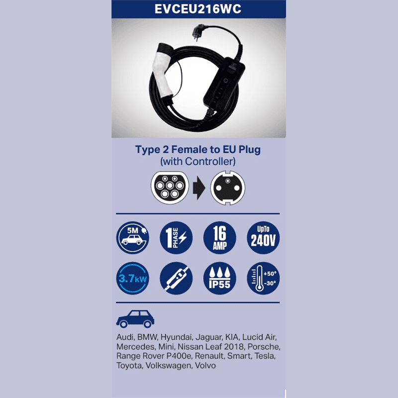 WAI EVCEU216WC PRIJENOSNA PUNJICA ZA ELEKTRIČNA VOZILA - 220V / 16A, 5 METARA, TIP2 - 1 FAZA